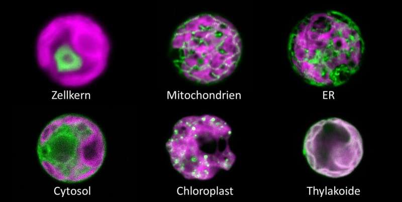 H 2 O 2 傳感器(綠色)位于由大葉綠體(品紅色)填充的衣藻細(xì)胞的 6 個隔室中。學(xué)分:AG Schroda