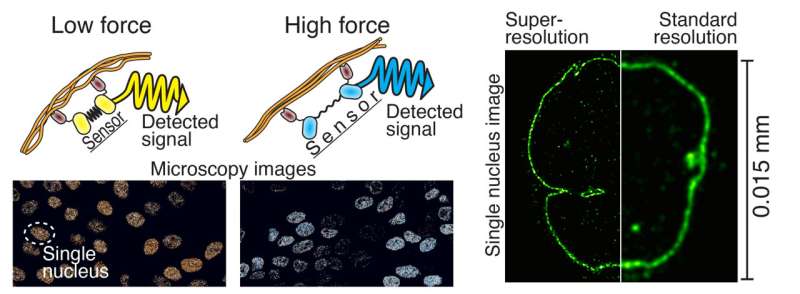 細(xì)胞內(nèi)力傳感器的作用原理為左。熒光蛋白(黃色和青色)來自水母,而橡皮筋部分(黑色)利用了蜘蛛網(wǎng)蛋白。靶蛋白結(jié)合抗體(深棕色)來源于羊駝。右圖是超分辨率顯微鏡和常規(guī)顯微鏡對細(xì)胞核成像的比較。資料來源:坦佩雷大學(xué)Teemu Ihalainen