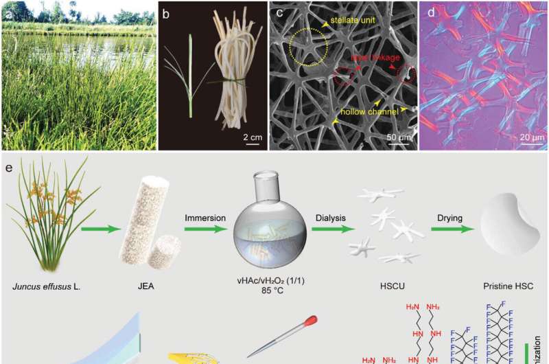 a)積液Juncus effusus L.(乙腦)b)提取乙腦通氣組織(JEA)泡沫。c) JEA網(wǎng)絡(luò)的SEM圖像。d)中空星狀纖維素單元(HSCU)的偏振光學(xué)顯微鏡圖像。e) HSC-TENG制備工藝及結(jié)構(gòu)示意圖。f) AgNWs電極的SEM圖像。g)原始中空星狀纖維素(PHSC)膜表面的SEM圖像。h)半透明可彎曲的PHSC。i)輕質(zhì)PHSC (3cm × 2cm, 19.86 mg)。學(xué)分:先進(jìn)功能材料(2023)。DOI: 10.1002 / adfm.202304801