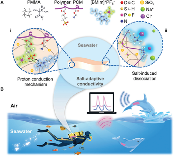 近年來(lái),中國(guó)科學(xué)院寧波材料技術(shù)與工程研究所智能高分子材料團(tuán)隊(duì)研究員陳濤和博士魏俊杰,致力于離子導(dǎo)電凝膠基智能傳感材料的研究,并利用疏水界面對(duì)水分子和導(dǎo)電離子的擴(kuò)散屏障功能實(shí)現(xiàn)了導(dǎo)電凝膠材料的水下多功能傳感應(yīng)用。然而,含鹽海水的高導(dǎo)電性會(huì)對(duì)離子凝膠傳感器的傳感性能產(chǎn)生明顯的抑制作用,導(dǎo)致離子導(dǎo)電凝膠的海洋傳感性能存在不足。對(duì)此,該團(tuán)隊(duì)近期在疏水界面結(jié)構(gòu)的基礎(chǔ)上,進(jìn)一步利用質(zhì)子導(dǎo)電機(jī)制和鹽誘導(dǎo)解離效應(yīng)設(shè)計(jì)了在海水環(huán)境中具有鹽適應(yīng)能力的離子液體凝膠材料,實(shí)現(xiàn)了海洋傳感應(yīng)用。