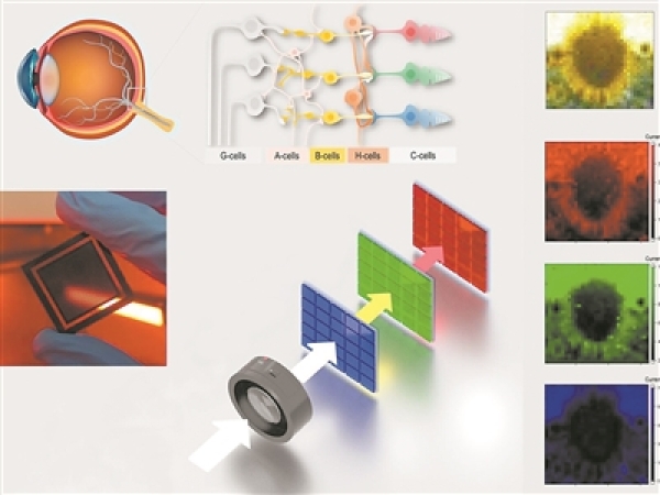 美國(guó)賓夕法尼亞州立大學(xué)科學(xué)家從大自然中汲取靈感,開發(fā)出一種新設(shè)備,可通過模仿人眼中的紅、綠、藍(lán)光感受器和神經(jīng)網(wǎng)絡(luò)來生成圖像。他們用模仿人類視錐細(xì)胞的窄帶鈣鈦礦光電探測(cè)器創(chuàng)建了一個(gè)新的傳感器陣列,并將其連接到模仿人類神經(jīng)網(wǎng)絡(luò)的神經(jīng)形態(tài)算法,以處理信息并生成高保真圖像。研究發(fā)表在最新一期《科學(xué)進(jìn)展》上。