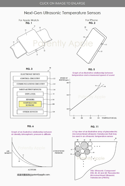 專利文件中還展示了該溫度傳感器的可能應(yīng)用場景,包括安裝在Apple Watch和iPhone等設(shè)備上。此外,專利圖還詳細(xì)解釋了傳感器的工作原理、溫度與聲速之間的關(guān)系、空氣密度與大氣壓強(qiáng)對海拔的影響,以及壓電微機(jī)械超聲波換能器陣列的構(gòu)造等。