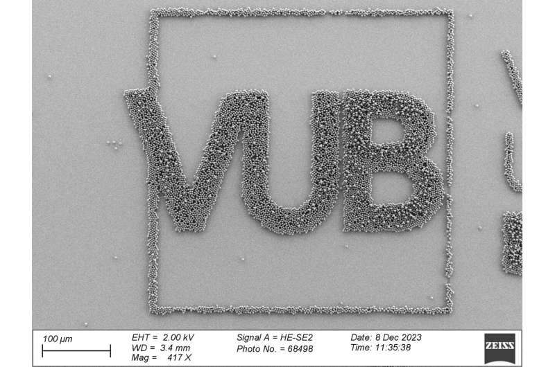 以 VUB 徽標(biāo)的受控形狀打印的微粒的 AFM 圖像。鱗片是100μm,是人類(lèi)頭發(fā)的厚度。圖片來(lái)源:伊格納斯·吉米達(dá)爾