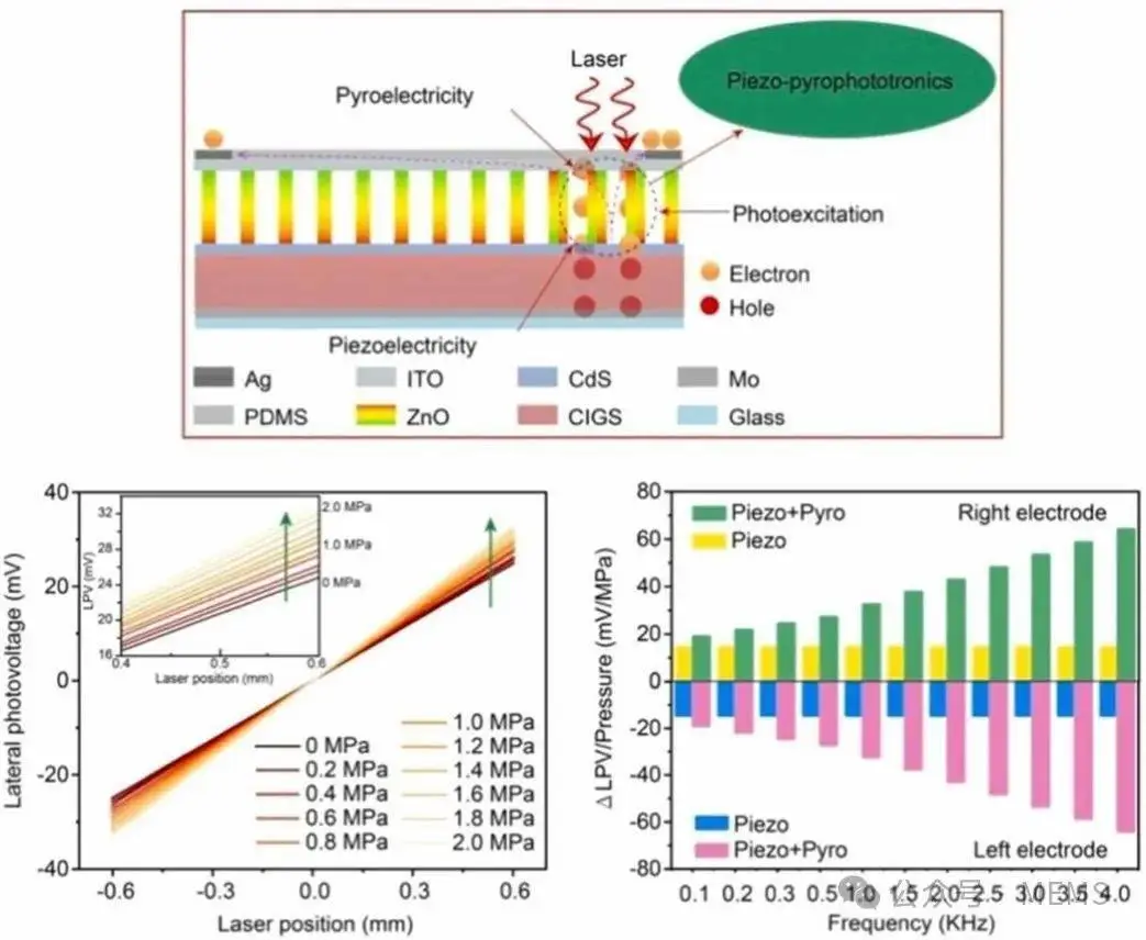 據(jù)麥姆斯咨詢介紹,河北大學(xué)物理科學(xué)與技術(shù)學(xué)院、河北省光電信息與材料重點實驗室的研究人員提出了一種新型傳感機制,利用由銅銦鎵硒(CIGS)組成的單片多層異質(zhì)結(jié)來檢測壓力。這種傳感機制結(jié)合了過剩載流子的光激發(fā)、載流子輸運改性的壓電性以及優(yōu)化非均勻光照下橫向光電效應(yīng)(LPE)中光電過程的熱釋電性。通過利用產(chǎn)生表面電荷載流子梯度的特殊照明,可誘發(fā)橫向光電壓(LPV),從而展示了傳感器的自供電特性。