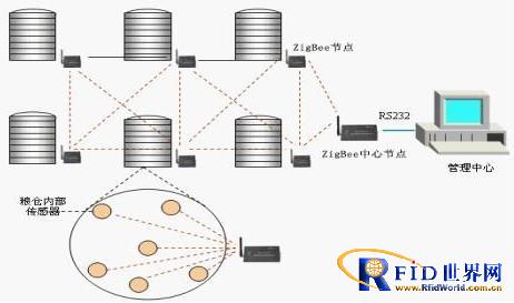 本系統(tǒng)是采用最先進的ZigBee無線傳輸技術(shù)。在糧庫的不同地方分置溫濕度傳感器,溫濕度傳感器是采用無線傳輸,將現(xiàn)場測量到的數(shù)據(jù)通過無線電磁波,傳送給糧庫內(nèi)的讀寫器,讀寫器再通過無線中繼器,將數(shù)據(jù)無線傳輸給電腦,電腦將接受到的數(shù)據(jù)存儲,并與系統(tǒng)設(shè)定的標準值比較。若現(xiàn)場值超出標準值,系統(tǒng)會報警告知管理人員,并會自動的控制風機等設(shè)備作降溫處理。
