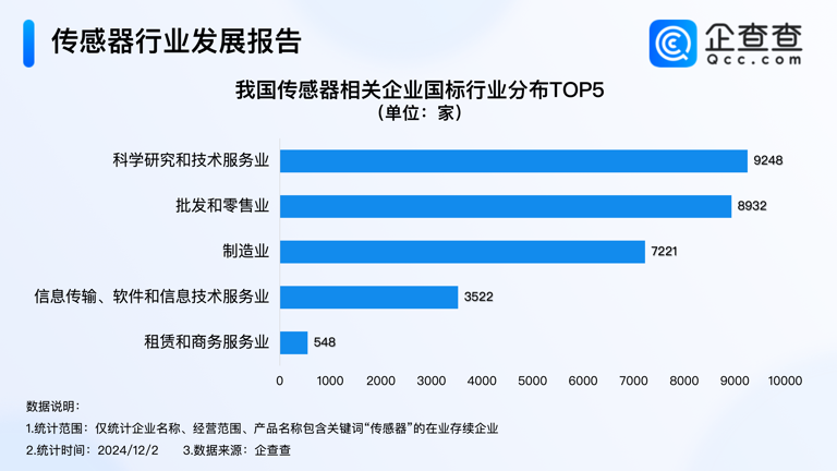 在行業(yè)分布方面,科學研究和技術服務業(yè)成為傳感器企業(yè)最為集中的領域,占比達到30.5%,共有9248家企業(yè)。緊隨其后的是批發(fā)和零售業(yè),占比29.5%,擁有8932家企業(yè)。制造業(yè)同樣占據(jù)重要地位,占比23.8%,共有7221家企業(yè)。