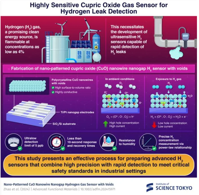 本研究提出了一種制備先進氫氣(H₂)傳感器的有效工藝,該傳感器兼具高精度與快速檢測的特點,能夠滿足工業(yè)環(huán)境中的關鍵安全標準。圖片來源:東京科學研究所