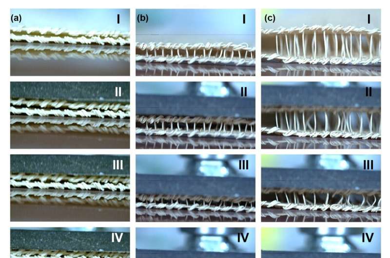 雙拉舍爾結(jié)構(gòu)隨間隔紗長度變化的變形與恢復(fù)實(shí)時(shí)觀測:(a) 2 毫米,(b) 5 毫米,(c) 15 毫米。羅馬數(shù)字對應(yīng)圖 8 中壓電能量產(chǎn)生的階段。圖片來源:《先進(jìn)功能材料》(2025)。DOI: 10.1002/adfm.202504271