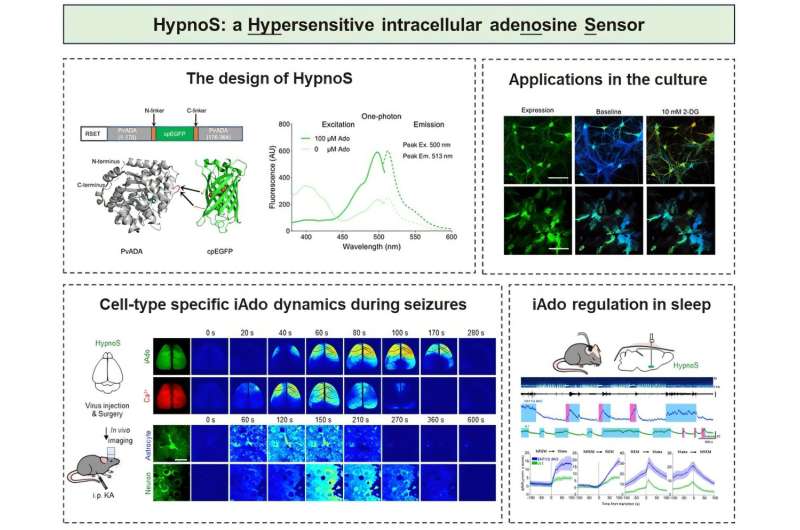 這種名為 “超靈敏細(xì)胞內(nèi)腺苷傳感器”(Hypersensitive intracellular adenosine Sensor, HypnoS)的工具,能夠在活體動(dòng)物大腦中以高時(shí)空分辨率監(jiān)測(cè)癲癇發(fā)作或睡眠 - 覺醒周期中的 iAdo 動(dòng)態(tài)變化。