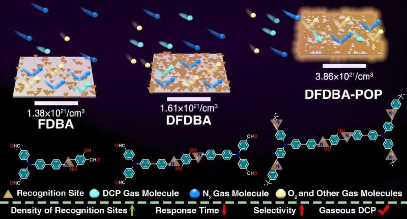 研究中,團(tuán)隊通過調(diào)控分子鏈長度,設(shè)計合成了一系列零背景熒光席夫堿材料(FDBA、DFDBA、DFDBA-POP),其 C=N 鍵作為識別位點的密度可通過分子結(jié)構(gòu)調(diào)控。實驗表明,增加 C=N 鍵密度和比表面積能顯著提升與 DCP 的碰撞效率,縮短響應(yīng)時間。