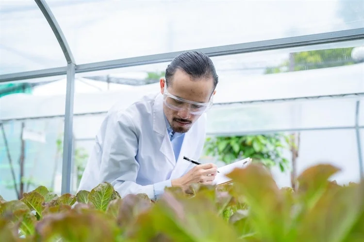 一位戴著護目鏡、穿著白色實驗服的男性科學家正在觀察植物,并用筆做記錄。
