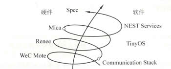 圖中描述了演示平臺螺旋式上升的無線傳感器節(jié)點(diǎn)軟硬件發(fā)展歷程。由于該平臺的硬件和軟件都是公開的,所以其成為研究傳感器網(wǎng)絡(luò)的最主要的試驗(yàn)平臺。Mica系列節(jié)點(diǎn)包括Wec、Renee、Mica、Mica2dot和Spec等,其中Mica和Micadot節(jié)點(diǎn)已經(jīng)由Crossbow (1995年成立,專業(yè)從事無線傳感器產(chǎn)業(yè)的公司)公司包裝生產(chǎn)。