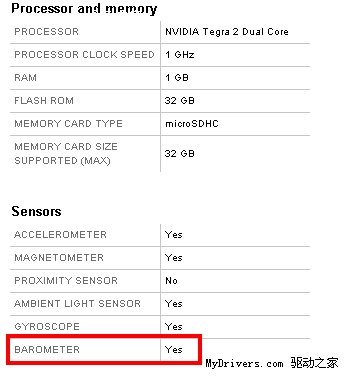 在摩托羅拉的開發(fā)者頁面中,摩托羅拉給出了Xoom的詳細(xì)配置,其中傳感器芯片中竟然出現(xiàn)了氣壓感應(yīng)裝置,這在手機(jī)和平板機(jī)設(shè)備中非常少見。這種感應(yīng)裝置可以通過對周圍的氣壓進(jìn)行感測,從而提供更準(zhǔn)確的天氣信息以及所處高度。