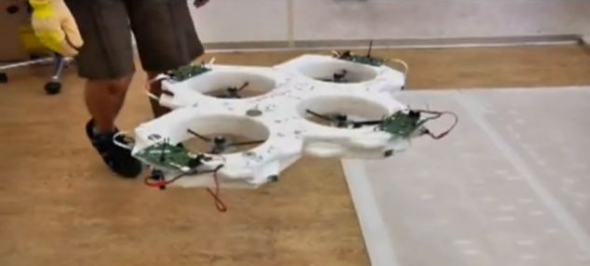 如果無(wú)人機(jī)組的水平飛行受到擾亂,每個(gè)四軸飛行器可以根據(jù)自身位置,獨(dú)立確定糾正這種混亂所需要的推力。雖然眼下還只是一個(gè)研究項(xiàng)目,但“分布式飛行列陣”(Distributed Flight Array)從理論上可以按比例增大,由許多單個(gè)無(wú)人機(jī)組成陣列飛行。由于可以攜帶對(duì)于單個(gè)無(wú)人機(jī)來(lái)說(shuō)過(guò)重的有效載荷,這套系統(tǒng)將具有廣泛的應(yīng)用前景。