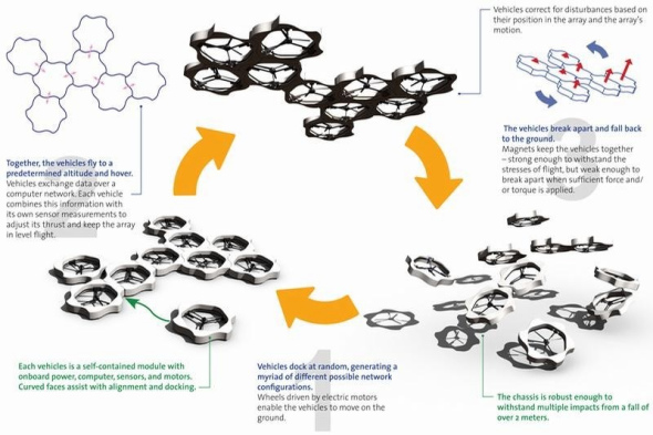 單個(gè)四軸飛行器都具有固定螺旋槳,可以驅(qū)動(dòng)它們升空,由這種方式驅(qū)動(dòng)的飛行總是飄忽不定,而且不受控制。不過(guò),一旦接在一起,這些相對(duì)簡(jiǎn)單的小機(jī)器人立即就變成復(fù)雜的多螺旋槳系統(tǒng),可以協(xié)調(diào)飛行。每個(gè)無(wú)人機(jī)組都配備了馬達(dá)、電腦和傳感器。除了微型螺旋槳導(dǎo)管系統(tǒng),它們下方還有幾個(gè)小輪子,令其可以在地面爬行尋找對(duì)方重組。