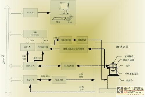 測(cè)試系統(tǒng)原理如圖4所示。振動(dòng)測(cè)試采用相對(duì)法,實(shí)現(xiàn)對(duì)汽車爆震傳感器3kHz~40kHz頻帶范圍內(nèi)任意頻率點(diǎn)的靈敏度測(cè)試,并可以對(duì)電容、絕緣電阻等檢測(cè)。測(cè)試系統(tǒng)采用PXI構(gòu)架,通過(guò)PXI模塊化儀器或GPIB儀器實(shí)現(xiàn)控制及信號(hào)采集。