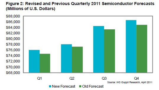 2011年每個季度的半導(dǎo)體銷售額都將高于先前的預(yù)估,如下圖所示。