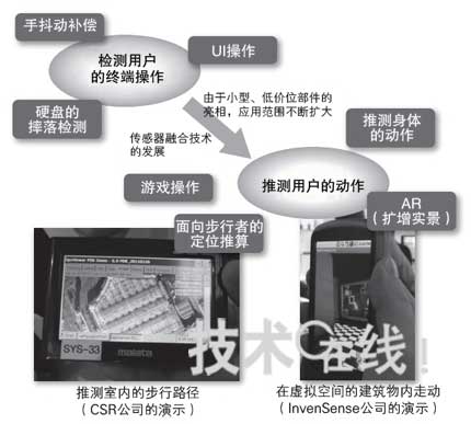 最近,智能手機等各種便攜產(chǎn)品也開始配備3軸加速度傳感器、角速度傳感器以及地磁傳感器,由此迎來了配備3種3軸傳感器的“9軸”時代?赏ㄟ^組合使用多個傳感器的輸出信號來檢測用戶動作。例如,在室內(nèi)推測步行者行走狀態(tài)的步行者航位推算(Pedestrian Dead Reckoning),以及使現(xiàn)實空間和虛擬空間聯(lián)動的AR(Augmented Reality,擴增實景)等用途似乎越來越廣泛。9軸時代的運動傳感器,除了精度、尺寸和價格等傳感器參數(shù)外,“能夠在何種程度上簡單地根據(jù)傳感器的輸出信號,獲得帶有某種含義的信息”的軟件的重要性也越來越高。(記者:竹居 智久)