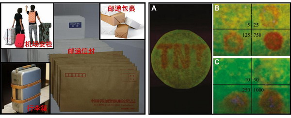 探測(cè)可疑包裹、郵件和恐怖分子隱藏在身上的炸藥一直是國(guó)際反恐和公共安全領(lǐng)域高度關(guān)注的課題。由于硝基爆炸物具有低蒸氣壓和高爆炸性,目前機(jī)場(chǎng)安檢主要依賴(lài)離子遷移譜和X射線衍射裝備,但難以做到快速、及時(shí)和低成本的探測(cè)。智能所課題組研究人員設(shè)計(jì)構(gòu)建了雙發(fā)射波長(zhǎng)的量子點(diǎn)比率熒光探針。探針的綠色熒光易受梯恩梯的影響發(fā)生淬滅,而紅色熒光不受影響,從而發(fā)生從綠色到紅色的顯色反應(yīng)?蒲腥藛T利用指紋提取技術(shù),進(jìn)一步研發(fā)出了方便操作的梯恩梯指示試紙。當(dāng)信封、合成纖維、包裹、橡皮等表面黏附肉眼看不見(jiàn)的梯恩梯殘留微粒時(shí),用這種試紙簡(jiǎn)單擦拭即可顯示顏色變化,靈敏度達(dá)到5納克/平方毫米。