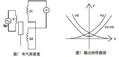 LVDT是由一個初級線圈,兩個次級線圈,鐵芯及線圈骨架,外殼等部件組成。當鐵芯在線圈中間位置時,次級線圈S1、S2所感應的電壓相等,由于輸出是反向串接,所以輸出電壓為零(如圖2所示);當鐵芯向上移動時,線圈S1和線圈P之間互感量增加,次級線圈S1感應電壓V1升高,線圈S2和線圈P之間互感量減少,次級線圈S2感應電壓V2降低,兩線圈電壓的代數和V=V1+V2,隨著鐵芯向上移動呈線性增加。當鐵芯向下移動時,兩線圈電壓變化相應與之相反,V1與V2的代數和隨鐵芯向下移動線性增加(因S1和S2線圈是反向串接),如圖3所示次級線圈電壓與鐵芯移動距離之間關系,即輸出特性曲線。