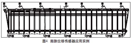 北京賽斯維測控技術有限公司推出的SensorWay系列3000XS、4000XS、5000XS傳感器已經在冶金爐體膨脹監(jiān)測中得到實際應用,并取得了良好的效果。如圖4所示的膨脹位移傳感器應用實例。在某冶金爐爐體一側的上、下縱向梁上共安裝了14個膨脹位移傳感器。由于各種原因,爐子縱向梁上各點膨脹位移量不同,14個傳感器按照均勻分布的原則進行布置,同樣在爐體另一側對稱安裝了14個膨脹位移傳感器,其最大行程均為0~50mm。在長方形爐體的兩個端墻側的上、下縱向梁也安裝了膨脹位移傳感器。