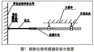 SensorWay系列膨脹位移傳感器體積小,在爐體上的安裝非常簡單方便,如圖5所示。在彈性鋼結構體的縱向梁上焊接螺栓,將帶有螺母的鐵芯擰入螺栓中,這樣鐵芯可以跟隨彈性結構體進行膨脹,裝有線圈的殼體上有兩個安裝支座,將支座用螺栓固定在樓板梁或焊有鋼結構的支撐件上,安裝時鐵芯與殼體的中心對準即可。