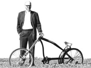 這輛自行車的設(shè)計和普通的自行車不太一樣,兩根長長的鋼管連接把手和前輪,坐凳設(shè)置比較低,要是裝上發(fā)動引擎,酷似美國1969年公映的電影《逍遙騎士》中的摩托車,有些嬉皮風(fēng)。別看這兩根鋼管又細又長,正是因為如此特別的設(shè)計才讓這輛自行車那么引人注目——是它使得自行車既不再需要凸制剎車把手,也不再需要長長的如蛇般的剎車線。