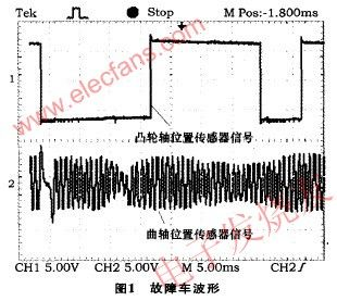 故障分析與測試采用雙蹤示波器同時測量故障車上曲軸位置傳感器與凸輪軸位置傳感器的波形如圖1所示,在同類型的正常車上測得的凸輪軸位置傳感器和曲軸位置傳感器波形如圖2所示!