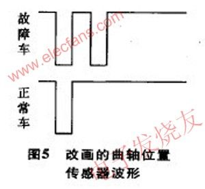 通過圖4還能看出曲軸位置傳感器波形出現(xiàn)2次才與凸輪軸位置傳感器波形重合一次起始位置,這種關(guān)系和本車曲軸轉(zhuǎn)速與凸輪軸轉(zhuǎn)速比為2:1的關(guān)系一致,也正好是1缸上止點(diǎn)的位置,也就是1缸點(diǎn)火正時的基準(zhǔn)位置,也決定了其它3個缸的點(diǎn)火時刻。此信號傳輸給腳,ECU就能發(fā)出點(diǎn)火信號,起動發(fā)動機(jī)。否則ECU就不發(fā)出點(diǎn)火信號,發(fā)動機(jī)不能起動。