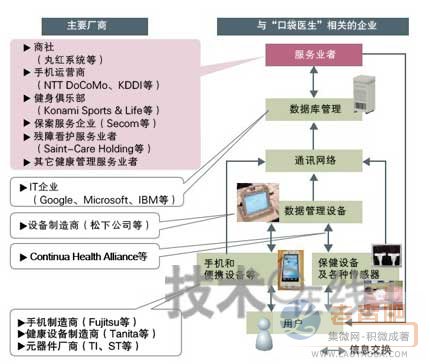 圖中所示為“口袋醫(yī)生”企業(yè)架構(gòu)及主要相關(guān)廠商。圖下部各種設(shè)備的開發(fā)此前已取得了進展,而近來,圖上部的服務(wù)商的行動也日益活躍。