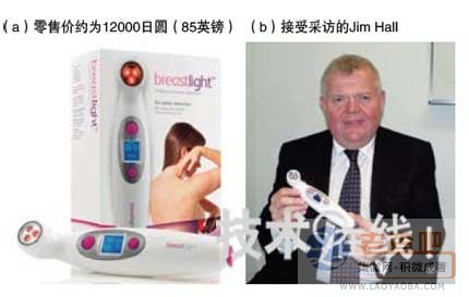 PWB Health公司研發(fā)和銷售的“Breastlight”家用乳癌傳感器(a)及該公司董事長Jim Hall(b)。