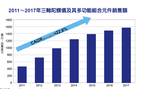 三軸陀螺儀(Gyroscope)及其多功能組合(Combo)元件銷售量將強(qiáng)勁增長。YoleDeveloppement研究報(bào)告指出,在消費(fèi)性應(yīng)用需求成長的驅(qū)動下,三軸陀螺儀及其多功能組合元件的銷售額,將從2011年的4億5,800萬美元,擴(kuò)大到2017年的15億7,000萬美元,成長將近四倍,年復(fù)合成長率(CAGR)亦高達(dá)22.8%。