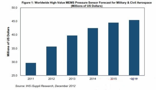 據(jù)IHS iSuppli公司的MEMS市場(chǎng)簡(jiǎn)報(bào),在高價(jià)值的軍用與航空領(lǐng)域,MEMS壓力傳感器市場(chǎng)今年將以兩位數(shù)的速度強(qiáng)勁增長(zhǎng),而且將來(lái)在多個(gè)利潤(rùn)豐厚的應(yīng)用領(lǐng)域有充足的擴(kuò)張空間。