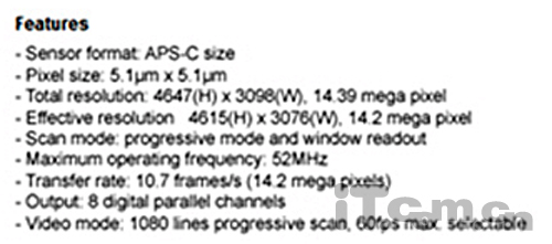 下圖是該傳感器的一些簡單數(shù)據(jù)它是一款APS-C規(guī)格的傳感器。該傳感器具備1k4萬像素,A/D芯片組,具備8個輸出通道,支持10fps的1080視頻。而如今的K20D/GX20/K7等還不具備A/D芯片組,只支持4個通道3FPS的720影像。
