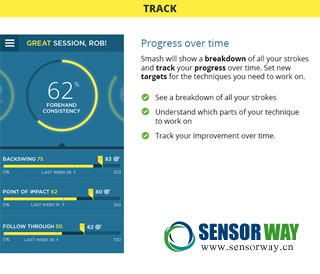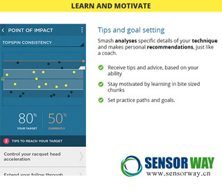 Smash網(wǎng)球運動監(jiān)測手環(huán)能夠充當個人網(wǎng)球教練的角色,可以用來記錄發(fā)球的種類和次數(shù)、球拍頭的速度和軌跡、旋轉(zhuǎn)的數(shù)量、手腕的旋轉(zhuǎn)等信息。它還能通過這些數(shù)據(jù)計算出訓(xùn)練、比賽中動作的一致性,從而矯正用戶的動作。從某種意義上講,它可以在一定程度上充當個人網(wǎng)球教練的角色。