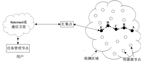 WSN是由大量傳感器節(jié)點(diǎn)組成的一個(gè)自組織的網(wǎng)絡(luò)系統(tǒng),每個(gè)傳感器節(jié)點(diǎn)都具備一定的數(shù)據(jù)采集、處理和無線收發(fā)的功能。雖然每個(gè)節(jié)點(diǎn)的資源和能力都非常有限,但通過節(jié)點(diǎn)間的有效合作,整個(gè)網(wǎng)絡(luò)能夠獨(dú)立完成大范圍、多信號的準(zhǔn)確檢測,并及時(shí)可靠地反饋采集信息。傳感器節(jié)點(diǎn)布置在檢測區(qū)域;用戶在控制臺完成檢測任務(wù)分配和對WSN的管理,通過Internet或通信衛(wèi)星,再經(jīng)由匯集點(diǎn)發(fā)送至WSN中相關(guān)節(jié)點(diǎn);相關(guān)節(jié)點(diǎn)采集信息并沿反向路由反饋給用戶。
