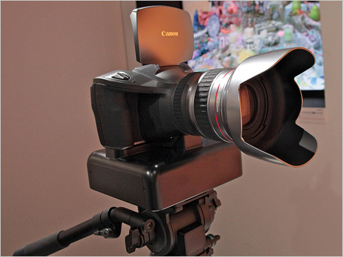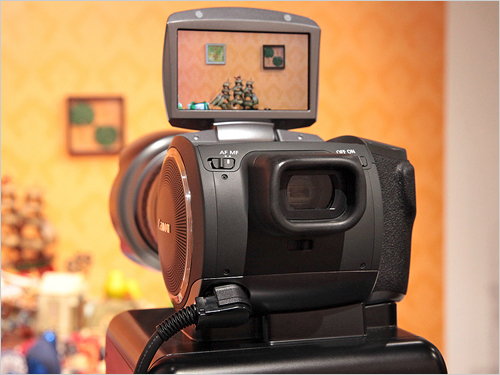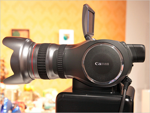 展會(huì)上佳能展出了一臺(tái)可拍攝4000分辨率動(dòng)態(tài)影像的概念攝像機(jī),這臺(tái)攝像機(jī)采用了800萬像素CMOS傳感器,配置了一支佳能20× 7-140mm F1.8-3.8 L IS USM鏡頭.其機(jī)頂還擁有一塊123萬像素4英寸液晶顯示屏。
