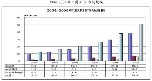 易觀國(guó)際預(yù)測(cè),2009年中國(guó)RFID市場(chǎng)規(guī)模將達(dá)到50億元,年復(fù)合增長(zhǎng)率為33%,其中電子標(biāo)簽超過(guò)38億元、讀寫器接近7億元、軟件和服務(wù)達(dá)到5億元的市場(chǎng)格局。
